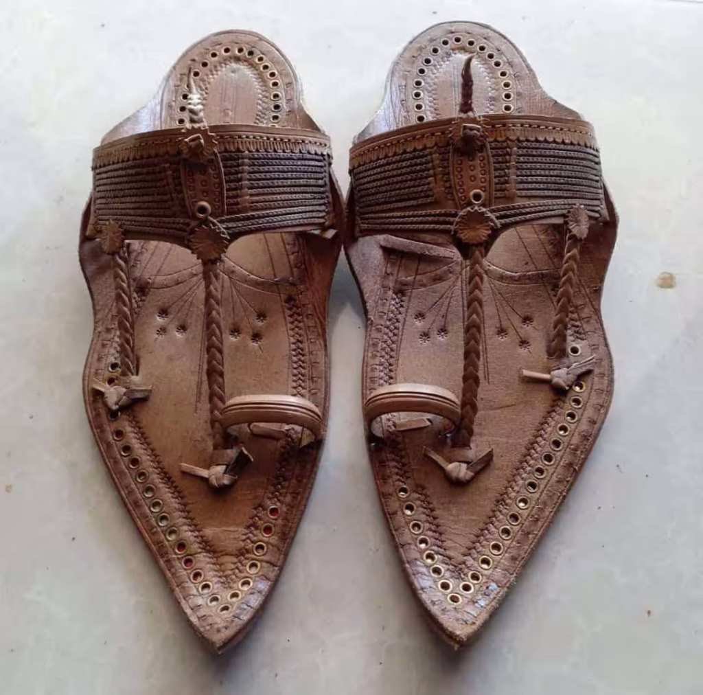 By the 13th century, these were being worn widely. Known earlier as Kapashi, Paytaan, Kachkadi, Bakkalnali, and Pukri, the names reflected the villages they originated from. Shahu I of Kolhapur and his successor Rajaram II promoted the craft, setting up 29 training centres during their reign. History records the Saudagar family as having created the design we recognize today in 1920. The earliest model – thin, with two side flaps was known as “Chappal with ears” or “Kanwali.”